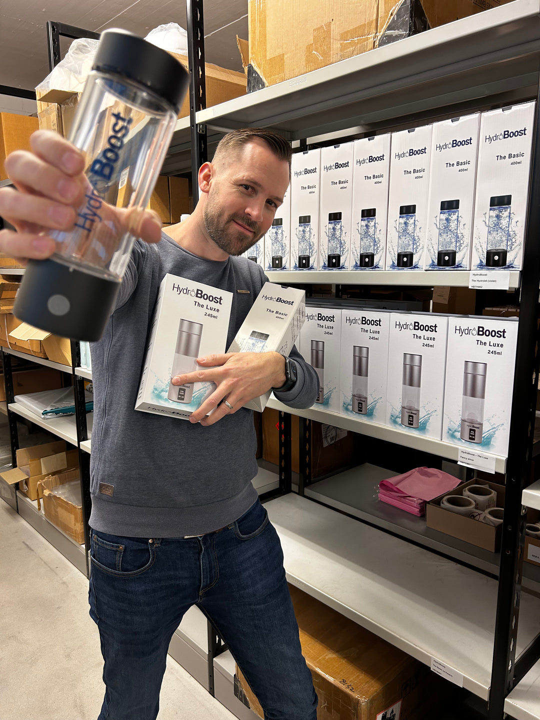 Fülle die HydroBoost Flasche mit Wasser, schalte die Elektrolysefunktion ein und warte einige Minuten, bis das Wasser mit Wasserstoff angereichert ist. Danach kannst du das Wasser ganz normal trinken.