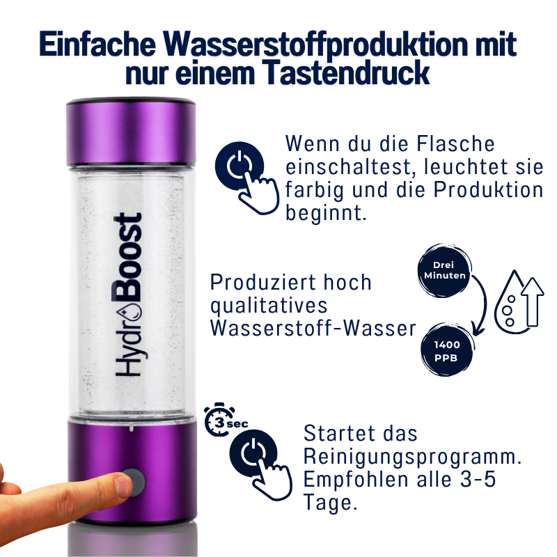 Die HydroBoost Wasserflaschen sind aber sonst sehr pflegeleicht. Es wird empfohlen, die Flasche regelmässig von Hand mit warmem Wasser und mildem Spülmittel zu reinigen und alle paar Wochen mit einer 1:1-Lösung aus Wasser und Essig zu entkalken. Diese einfache Routine sorgt für eine effiziente Wasserstoffproduktion und verlängert die Lebensdauer deiner Flasche.